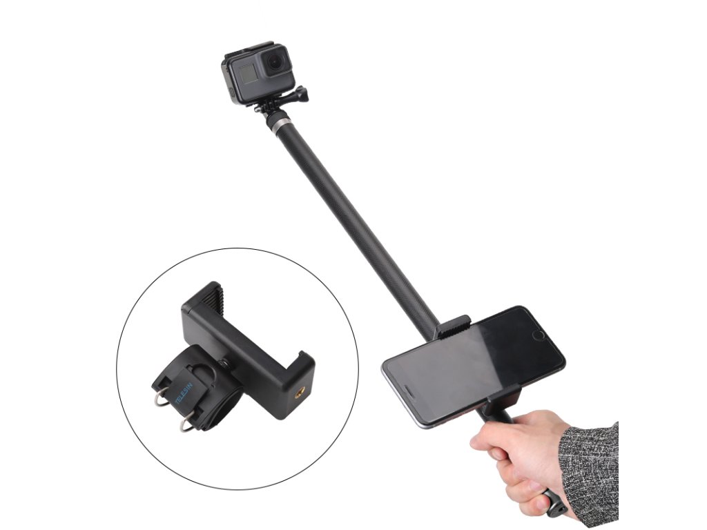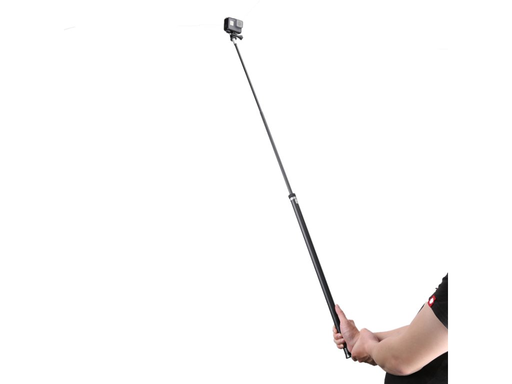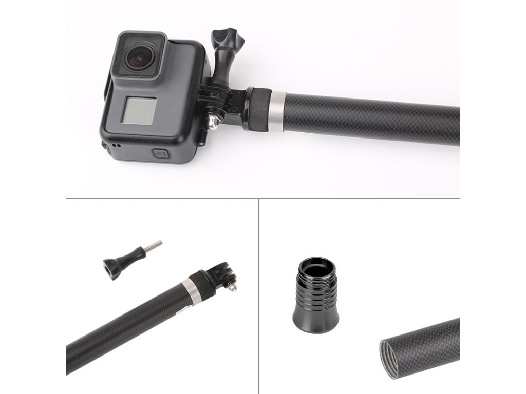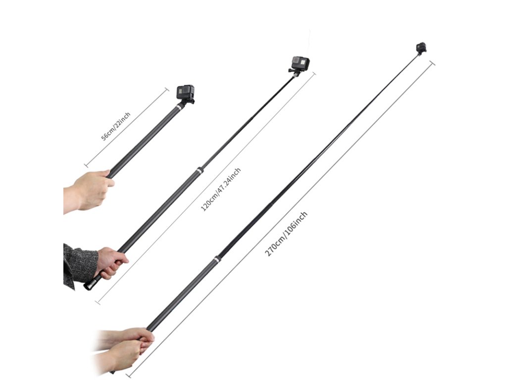 Karbonová selfie tyč (monopod) dlouhá 2,7 metrů určená pro kamery GoPro, Xiaomi Yi, SJCAM atd. Ideální pro 360° kamery, které umí zneviditelnit tyč v záběru. Balení obsahuje selfie tyč, koncovku pro uchycení kamery a šroub.