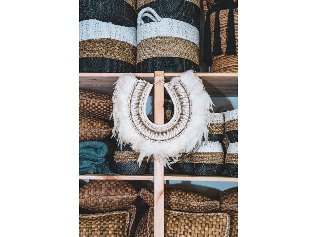 Tradiční závěsný balijský náhrdelník na kovovém stojanu - bílé peří
